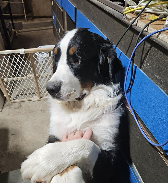 Killian is an incredibly energetic boy and weighs around 125 lbs, making him 0n the larger side for a male Bernese Mountain Dogs. He enjoys playing outside with Emma and his Belle, showing a gentle nature towards them. Killian also loves to communicate with his human dad sharing his feelings. Once all his testing is completed, we plan to use him as stud.